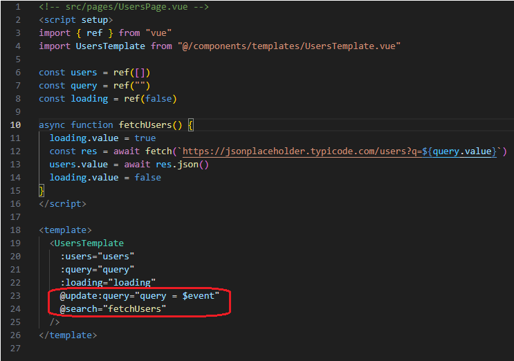 @search=”fetchUsers”: O filho emite search (por exemplo, quando o usuário clica em um botão). O pai executa fetchUsers para atualizar a lista.