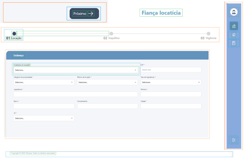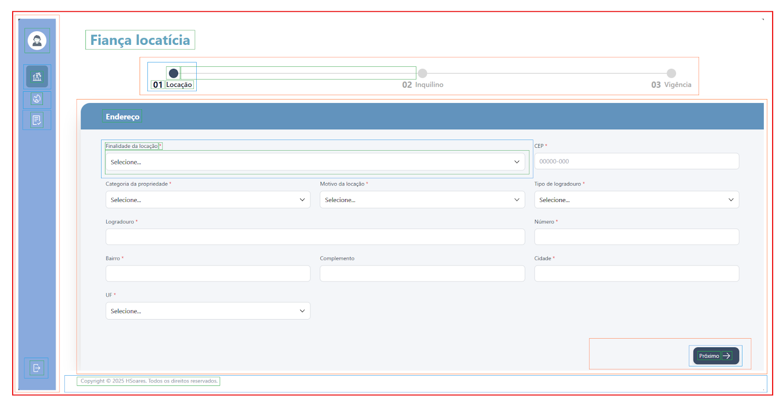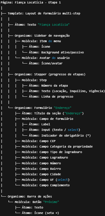 - Página “Fiança Locatícia – Etapa 1 (Locação)”, que utiliza o template de formulário multi-etapas preenchido com os campos de endereço.